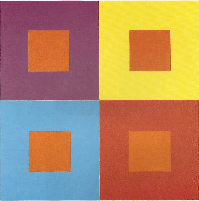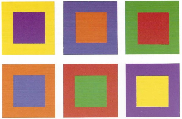 Notice how four identical orange squares appear to differ from one another when placed against backgrounds of different colors.