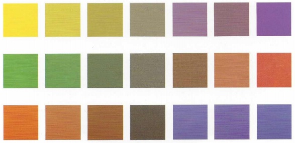 Theoretically, equal mixtures of complements will produce gray. Here, colors on the left are mixed in gradual steps with those or right their complements. Note how the intensity of a color is reduced when some of its complement is added to it. This neutralizing effect is useful when you want to make a color appear to recede in a composition, or convey specific effects of light and shadow on a color.