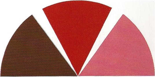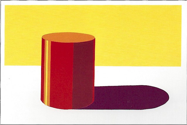This red cylinder is illuminated by yellow light. Violet, the complement of yellow, is added to the shadow side of the cylinder, where it mixes with the form's local, or actual, color to become a muted red-violet. The cylinder's cast shadow on a white surface has much violet in it.