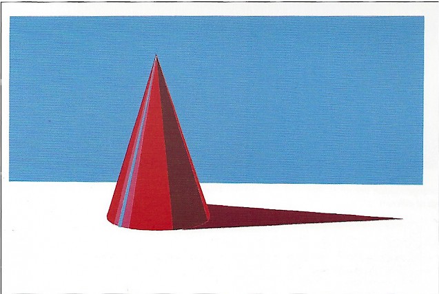 This red cone is illuminated by blue light. Its shadow side has orange added to it, as does the cast shadow. Look for the complement of the light's color in shadows and cast shadows.