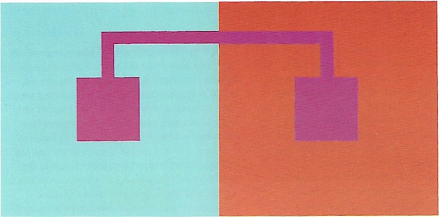 At first glance the blue diamonds appear to be the same color, but if you look along the bottom margin, you will see that they are not identical. The blue at right, against the violet background, has been slightly altered to make it appear the same as the blue at left. The alteration compensates for the effects caused by the different background colors.