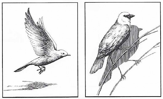 In the drawing at near right the separation between the bird and its cast shadow shows that the bird is off the ground. In the drawing at far right the bird's cast shadow tells us that there is a wall close to the bird and that the light source is frontal.
