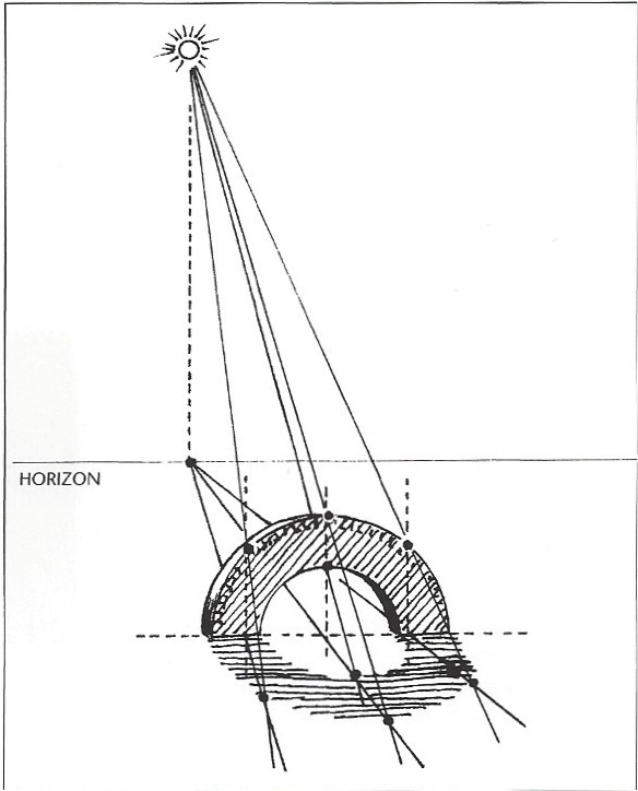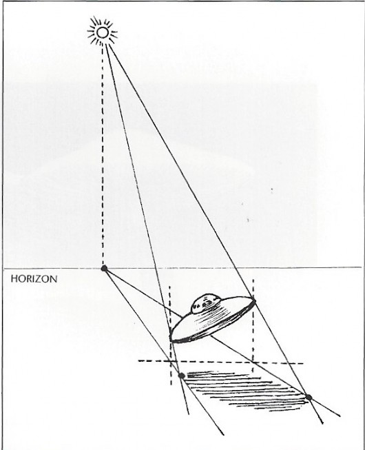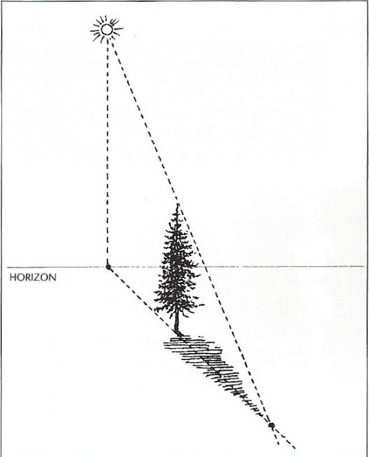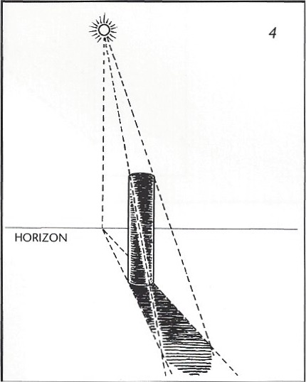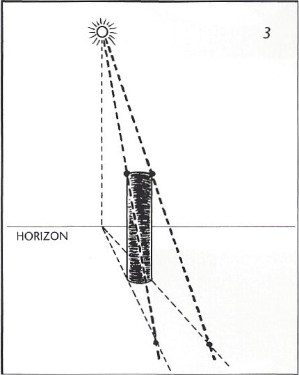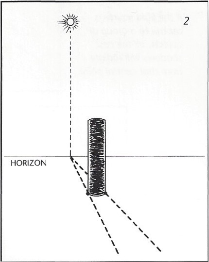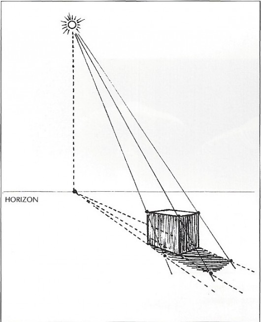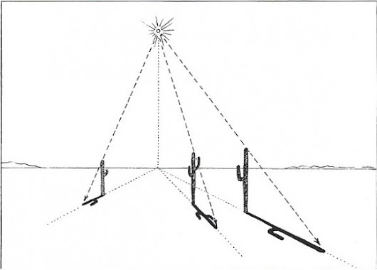 1. To calculate length and direction of a cast shadow, first locate the light source, and then locate the point directly beneath the light on the surface (plane) receiving the cast shadow. Make a mark ot the imagined point of contact. (When the sun is close to the horizon, the horizon is the point of contact.)