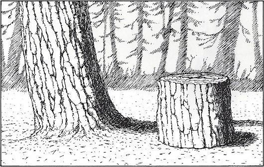 The tree trunk at left grows out of the ground and appears continuous with it. The trunk at right, however, appears to sit on top of the ground, a physical separation effectively indicated by a proximity shadow.