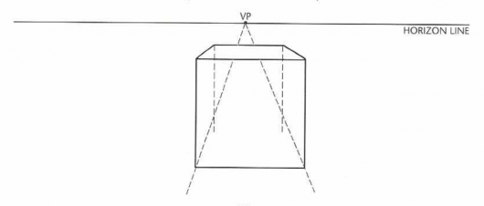 The two most common and useful types of perspective are one-point and two-point perspective. The simplest demonstration of one- point perspective is to look down a straight road. We know the road to be the same width throughout its length, and yet as we look toward the horizon the road appears to get increasingly narrow, until it diminishes to a point on the horizon. This is called the vanishing point because it is where the road appears to vanish. On level ground, the vanishing point is always on the horizon. Place a cube in this road with the sides of the cube parallel to the sides of the road. The lines that describe the receding edges of the cube will converge at the same vanishing point that the road does. All receding parallel lines will share the same vanishing point.