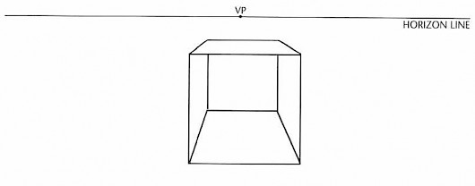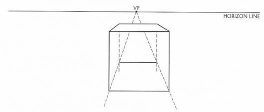 One-point perspective is also used when you are depicting boxes or interiors that have races or walls parallel to the picture plane. The horizontal and vertical lines on the faces parallel to the picture plane are drawn perpendicular to each other. All other receding edges or an object will converge at a point on the horizon line. In one-point perspective, the front and back of a cube are parallel to the picture plane. They are drawn as squares with perpendicular corners. The top, bottom, and sides of a cube in one-point perspective recede into space. The lines defining their receding edges will converge at a point somewhere behind the cube.