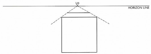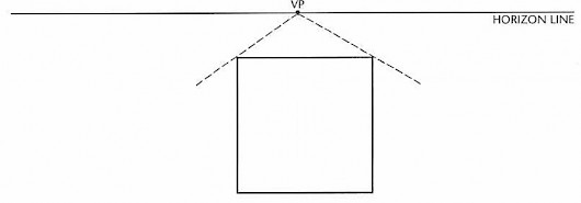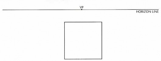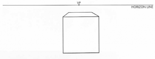 To establish the top of the cube, draw lines from the top corners of the square to a point behind the cube on the horizon line.