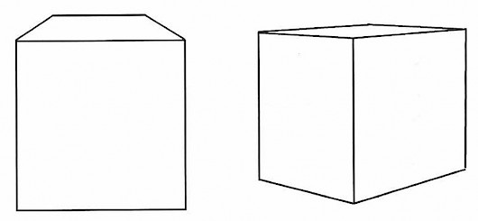 In one-point perspective, whole sides of the cube are parallel to the picture plane, as the example at near right shows. In two-point perspective, only the cube's vertical edges are parallel to the picture plane, as in the example at for right.