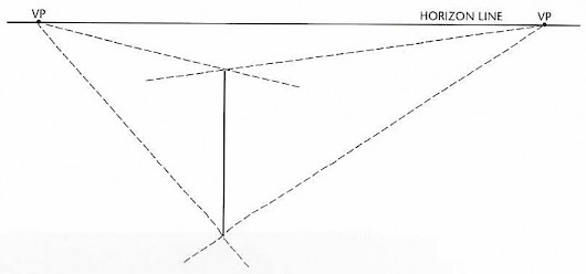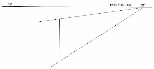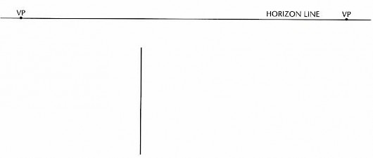 To draw a cube in two-point perspective, we start with the vertical edge nearest the picture plane. Vanishing points are placed (arbitrarily for now) on the left and right sides of the horizon line.