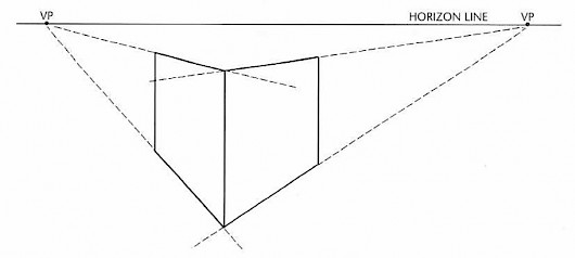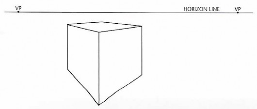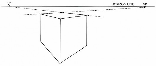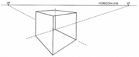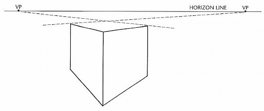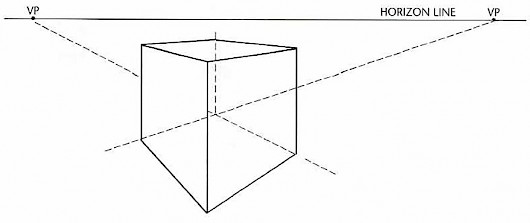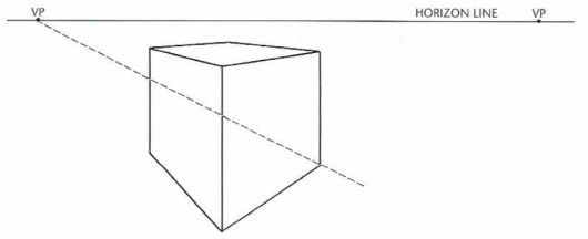 With a cube in two-point perspective, only the verticals are truly parallel to each other. All other lines will appear to point to one of two vanishing points. If the cube is level, the vanishing points will be on the horizon. All lines parallel to each other will share the same vanishing point. The farther apart the two vanishing points are placed, the farther away from the object your viewpoint appears to be.