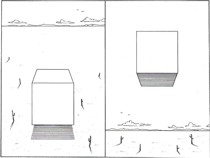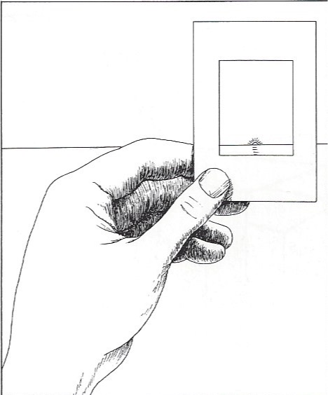 The other concept to understand is the horizon line, which is, of course, the horizon; it is also called the eye level. Imagine a piece of cardboard with a rectangle cut out of it-a viewfinder. If you hold the viewfinder at the level of your eye, the horizon will be in the middle of the opening. If you lower the viewfinder, the horizon appears to move to the top of the opening. If you raise the viewfinder, the horizon appears to move to the bottom of the opening. Thus, in a drawing, when the horizon is high on the page, our focus is on things below our eye level (we are looking down). When the horizon is low on the page, our focus is on things above our eye level-over our head (we are looking up).