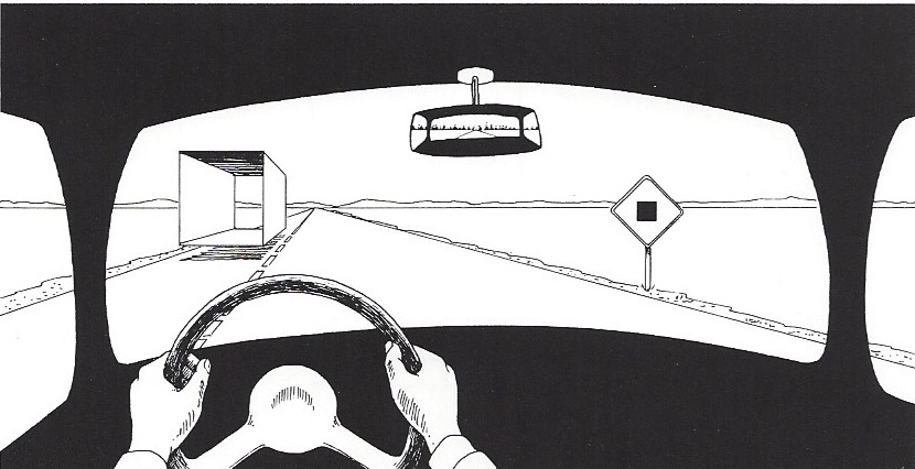 In one-point perspective, a straight flat road seems to get narrower in the distance, although we know that it doesn't. Imagine a box whose receding edges are parallel to those of the road. All of these edges "vanish" at the same point on the horizon.