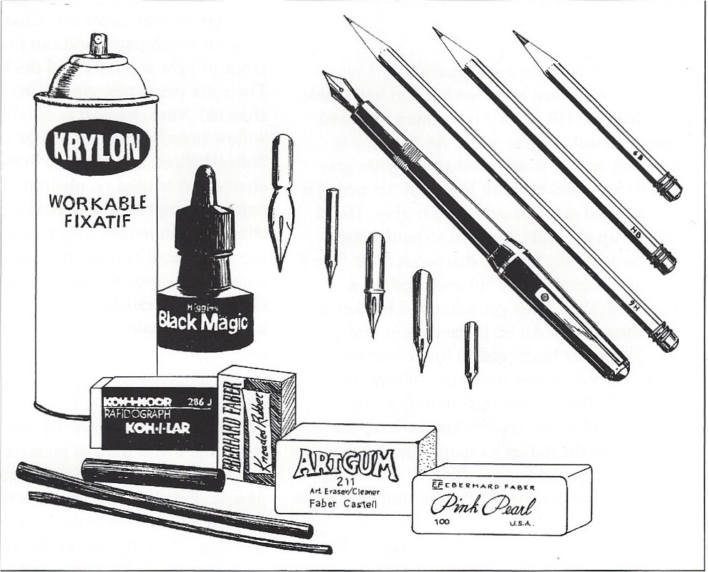 Virtually anything can be called into service to make a drawing. The artist's imagination and invention are the only limitations. In art school we drew with stale coffee, using the chewed end of a matchstick as a brush. There are, however, more traditional materials, ones that have served the most purposes for most artists over time. This very brief survey is simply meant to give you something to work with as the book proceeds; I encourage you to explore many different materials, a process that can be the source of inspiration.