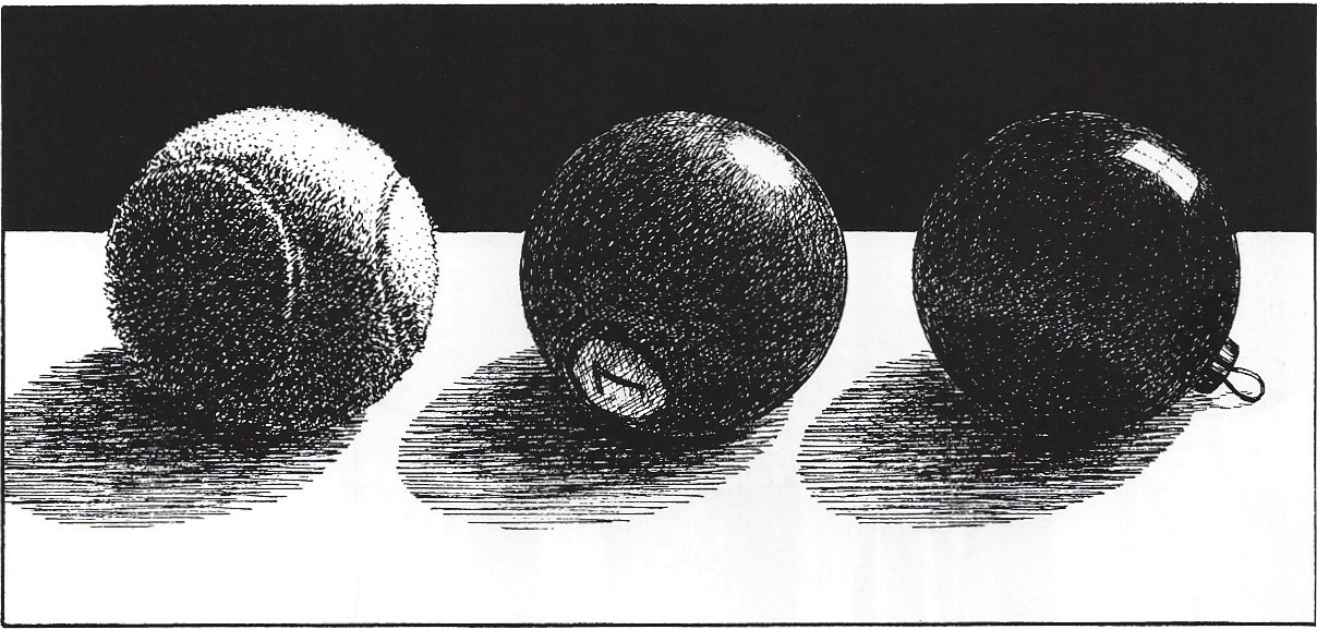 Highlights on objects are reflections. Although we usually think of reflections as appearing on smooth surfaces, they do appear on rough surfaces as well, but in unfocused form. Here, the light area on the tennis ball (left) is an unfocused reflection. The edges of a highlight tell us visually how smooth or rough an object is. Because the reflection on the seven ball (center) is less focused than the one on the Christmas ornament, we know the ornament has a microscopically smoother surface.
