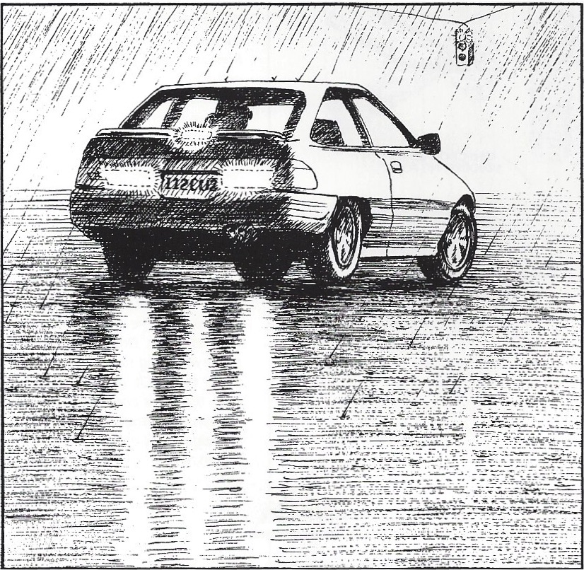 Reflections on an irregular but flat reflecting surface appear larger than the object's height because the reflection is repeated in the irregularities of the surface. The most extreme example of this type of reflection is one that emanates directly from a light source. While driving behind another car on a rainy day, notice how its reflection in the wet pavement is vertically larger than the car itself, and how, when the brakes are applied, the reflections of the brake lights extend beyond the car's reflection. A sunset over water is another example; the sun's reflection is elongated because the water's surface is irregular.