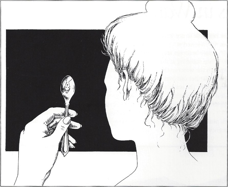 Reflections on shiny curved surfaces are distorted according to the specific contour of the reflecting surface. A cylinder, for example, converts the features of objects reflected in it into parallel stripes. A reflecting sphere shrinks the image and gives a wide-angle view of its surroundings. A slightly concave surface causes the reflection of an image to appear larger than the image itself, while a very concave surface compresses and inverts the image. A cone compresses reflected images into triangles.