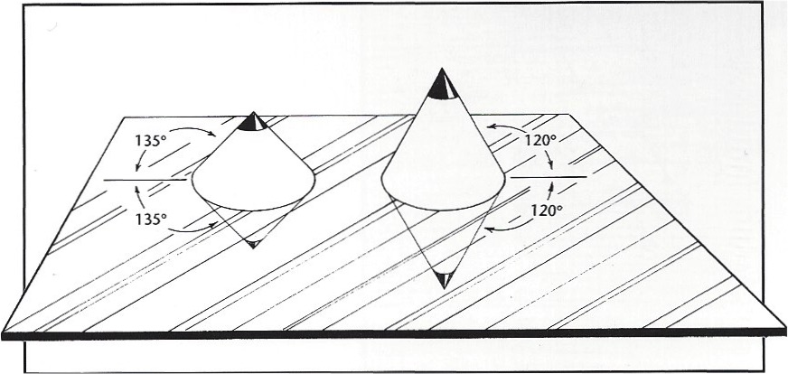 When part of the outline of an object's silhouette is parallel to the picture plane (the paper's surface) and that outline contacts a reflecting surface, it is possible to calculate the correct angle of the object's reflection. The illustration at the bottom of the page shows how this works with cone-shaped objects.