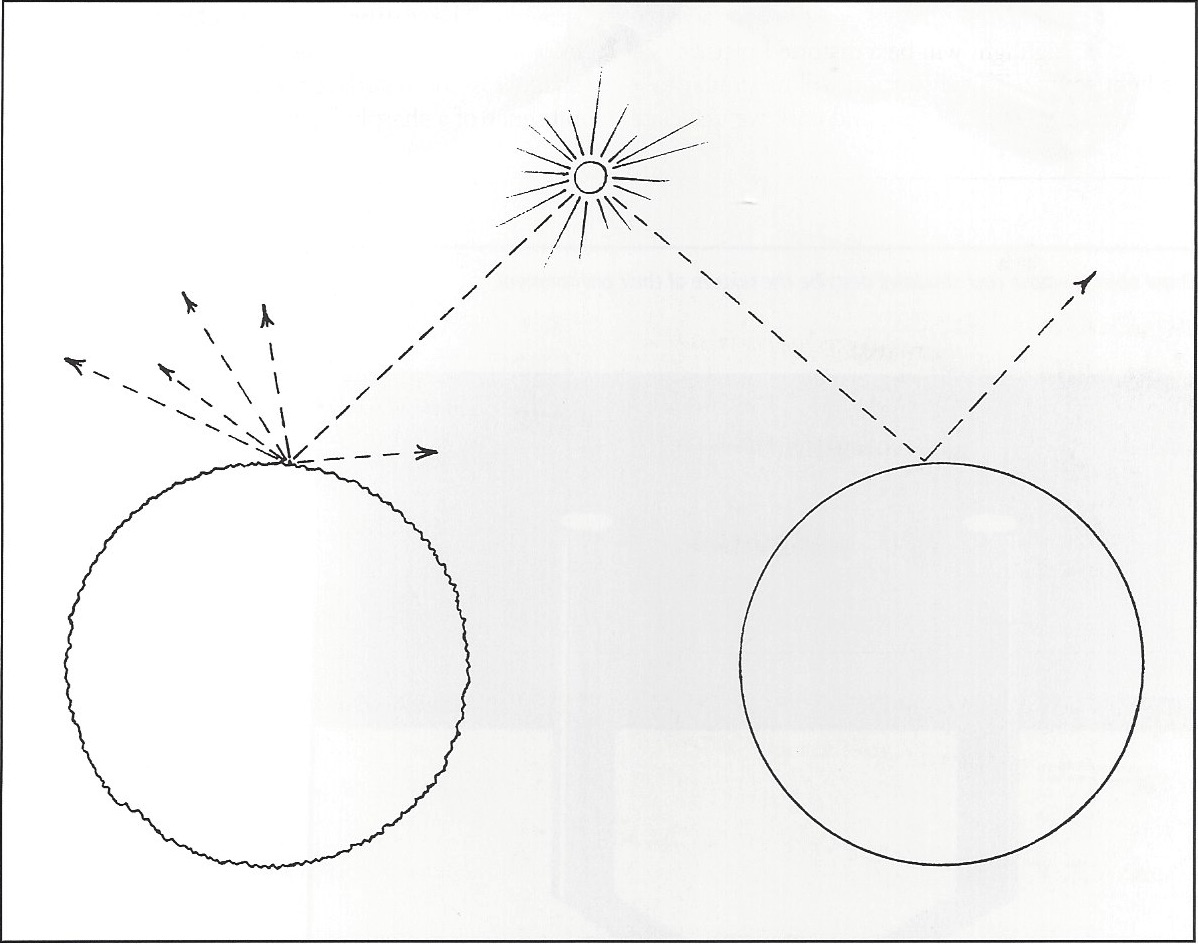 Light that falls on a rough object is dispersed in many directions. Light that falls on a smooth object bounces off it in a single direction and is seen on the object's surface as a distorted picture of the fight source. Reflections help define how smooth a surface is.