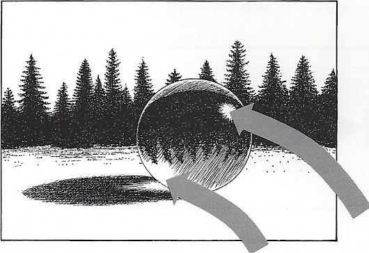 A hollow transparent object, like the empty jar at left, is visible at its edges. What is seen through it remains relatively unchanged. One way we can tell that a transparent object is solid, like the water-filled jar at right, is by the way it distorts the image of what is behind it.